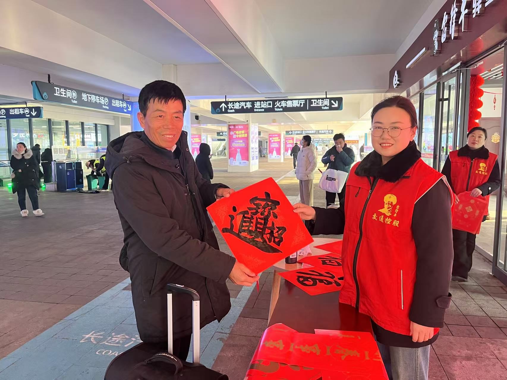 很快,旅客們紛紛圍攏過來,挑選自己心儀的春聯(lián)?,F(xiàn)場氣氛熱烈而溫馨,大家臉上都洋溢著喜悅的笑容。在外務(wù)工歸家的張先生拿著剛剛挑選到的春聯(lián),激動地說道:“在回家的路上能收到這么喜慶的春聯(lián),心里別提多暖了,感覺新年的氛圍一下子就濃了?!?志愿者們穿梭在人群中,一邊幫忙遞春聯(lián),一邊與旅客親切地嘮著家常,詳細詢問他們的返鄉(xiāng)路程,還不忘貼心地囑咐他們注意旅途安全。