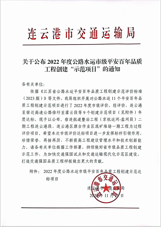 402省道贛榆南環(huán)段路基橋涵工程S402GYNH~SG2標段工程項目順利通過2022年度公路水運市級平安百年品質工程“示范項目”。