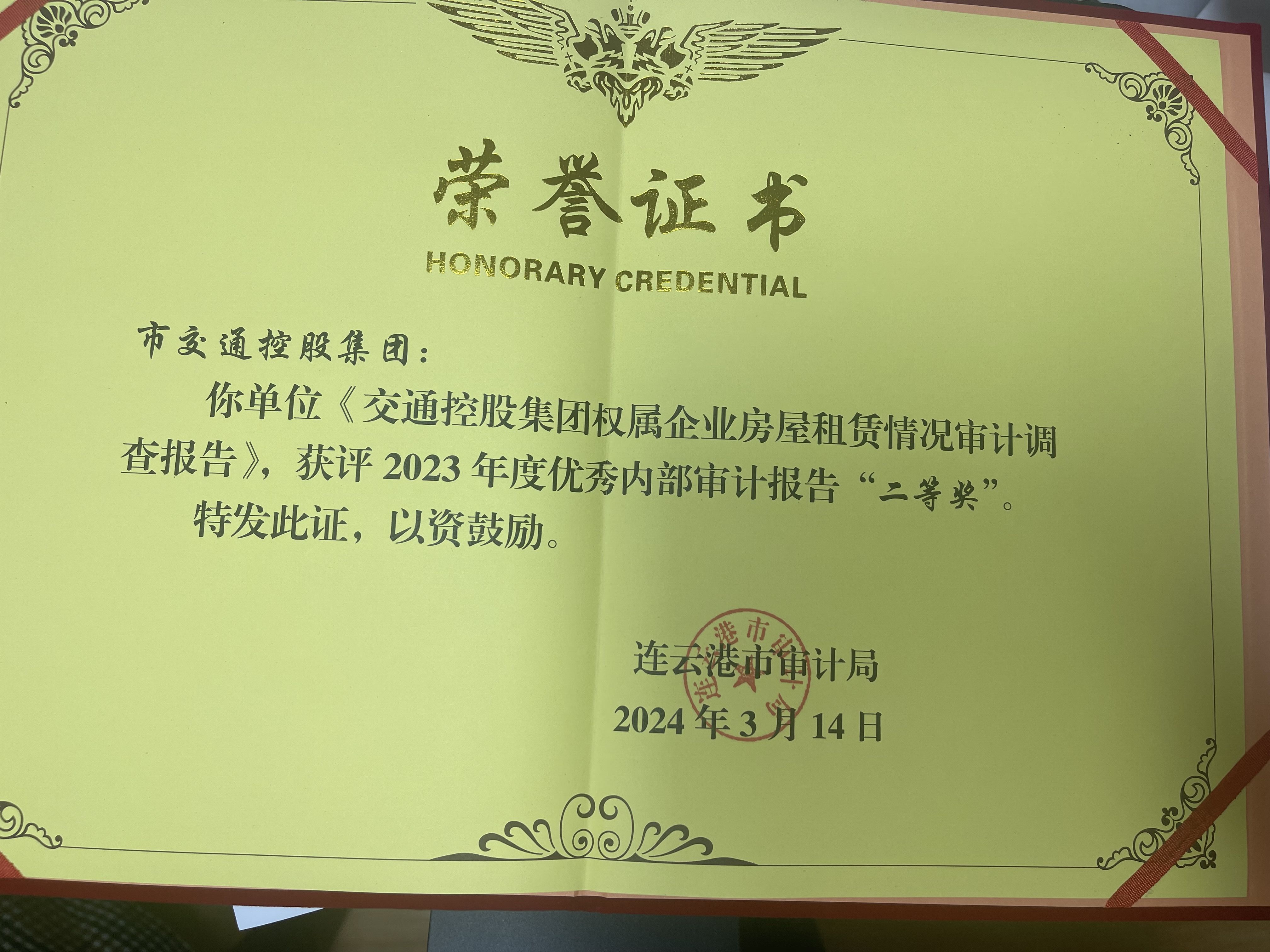 日前,集團(tuán)在市審計局舉辦的2023年度全市內(nèi)部審計工作評比中獲評“先進(jìn)單位”。集團(tuán)審計部報送《交通控股集團(tuán)權(quán)屬企業(yè)房屋租賃情況審計調(diào)查報告》獲評2023年度優(yōu)秀內(nèi)部審計報告“二等獎”。