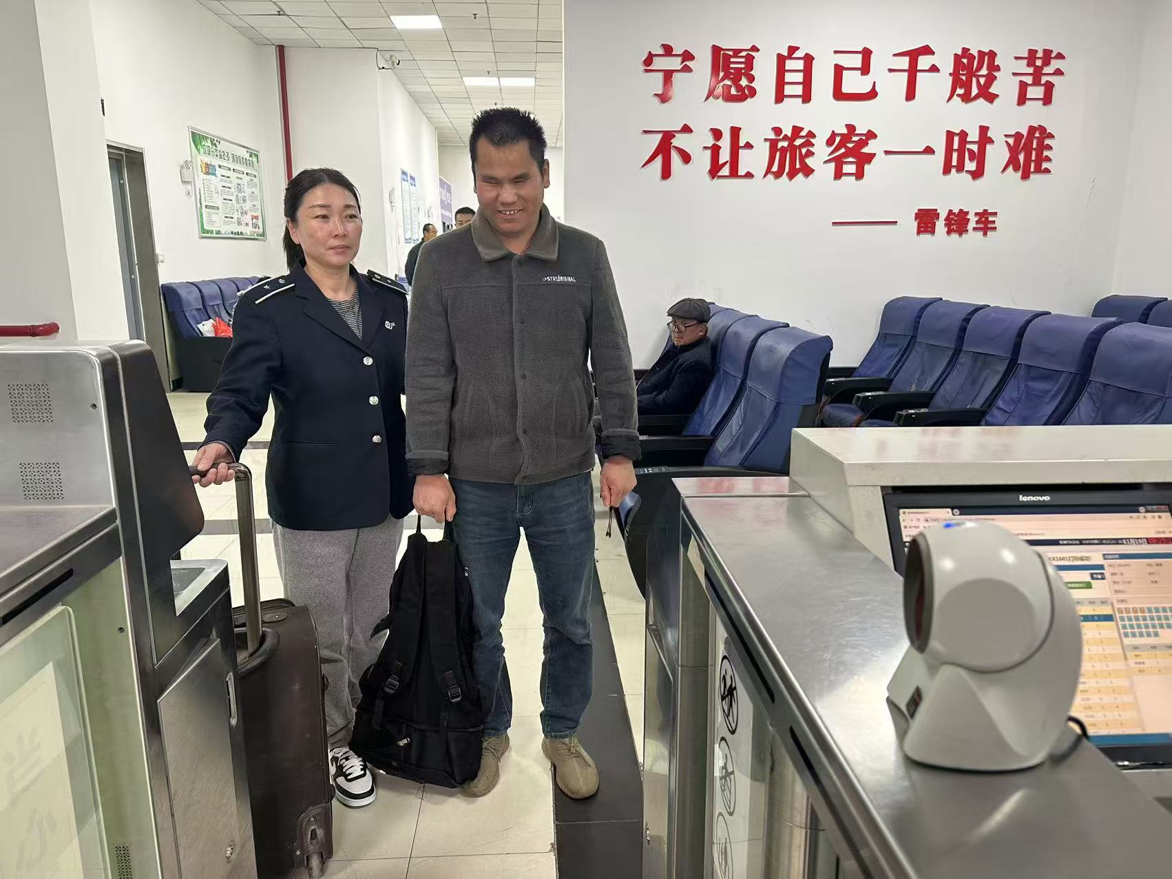 “您別急,我來幫您。”朱靜溫柔的話語如同冬日暖陽,瞬間溫暖了這位特殊旅客的心。她小心翼翼地接過旅客手中的行李,并細(xì)心地引導(dǎo)旅客通過安檢儀。在整個(gè)過程中,朱靜始終保持著耐心和細(xì)心,確保旅客能夠安全、順利地完成安檢程序,直至將旅客送上去往濱海的班車上。