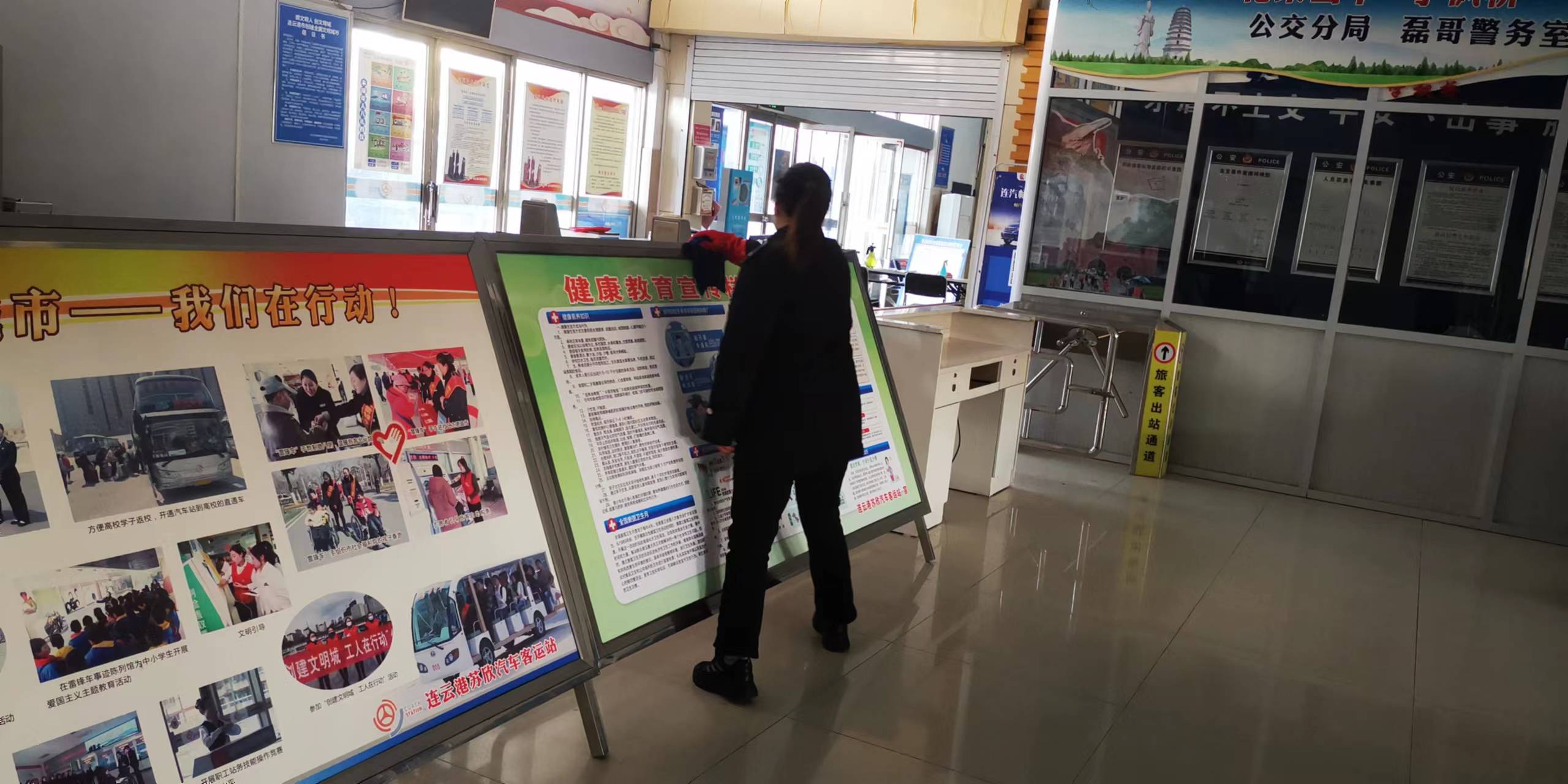 外部環(huán)境有“面子”。根據(jù)各客運站點實際情況,對站內(nèi)外衛(wèi)生區(qū)域進行細(xì)分,責(zé)任到人。定期開展大掃除,對站前廣場、售票廳、候車廳、發(fā)車區(qū)等進行全方位清掃,重點清理高處玻璃墻面及綠化帶內(nèi)的煙頭垃圾,不放過一處死角,保持客運站環(huán)境衛(wèi)生整潔、設(shè)施完好。站前停車區(qū)域增設(shè)了無障礙停車位。在蘇欣站、新浦汽車總站、海州站站前廣場加派值班人員,按時到崗到位,在分包點位來回查看,按照要求規(guī)范車輛停放和制止店外經(jīng)營行為,清除墻體“牛皮癬”,并主動向過往市民宣傳創(chuàng)建文明城市的重大意義,引導(dǎo)市民提高文明意識。