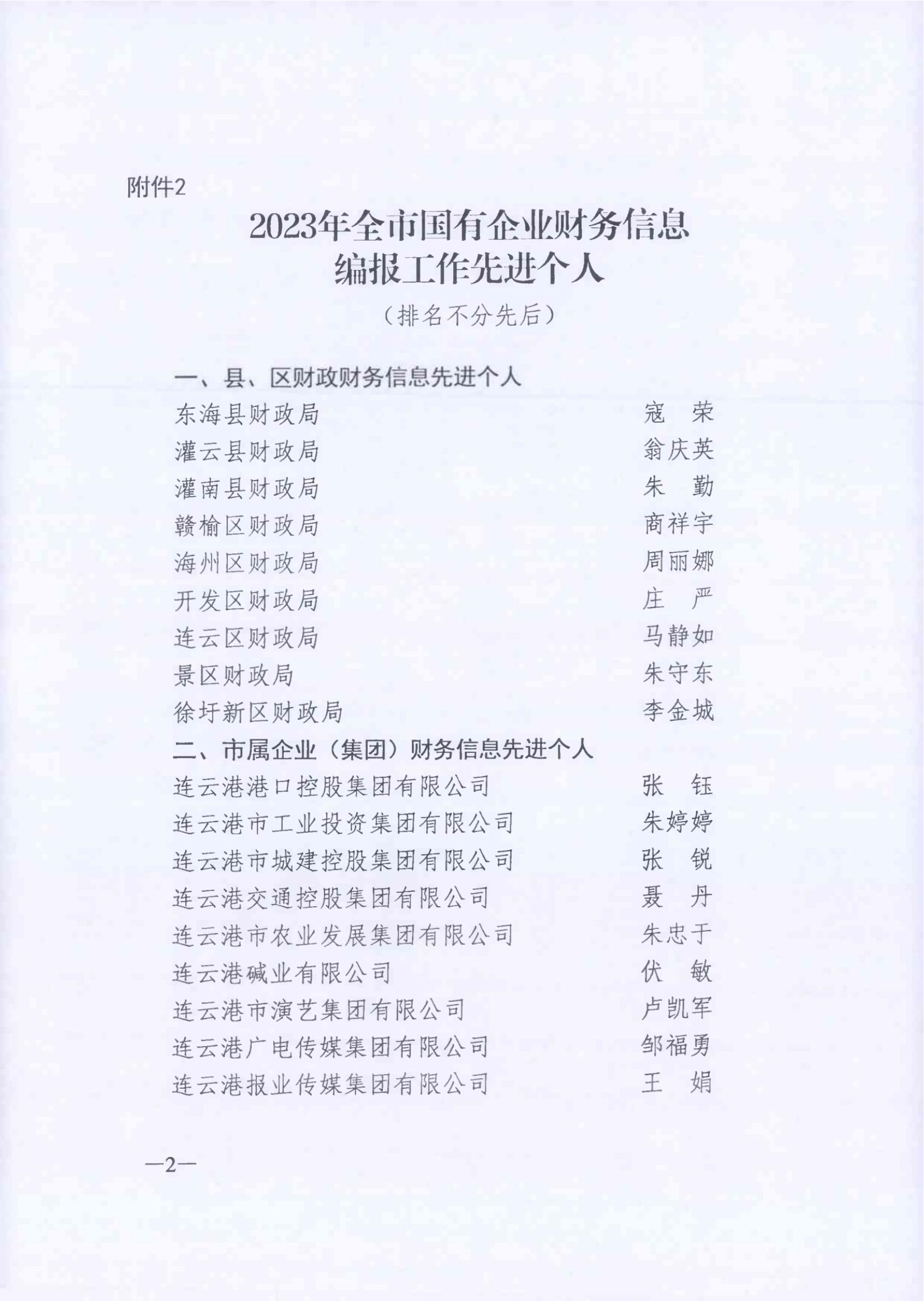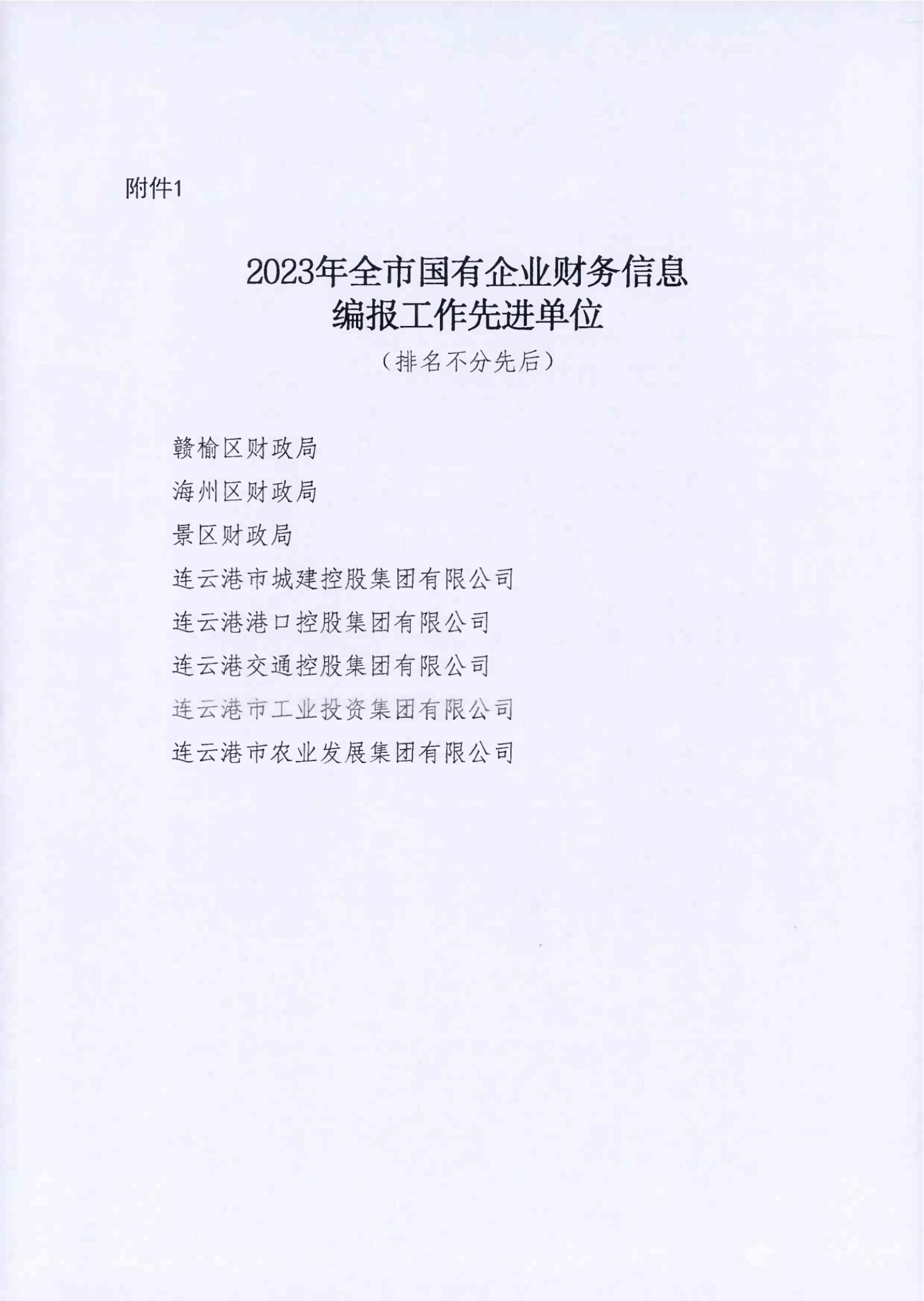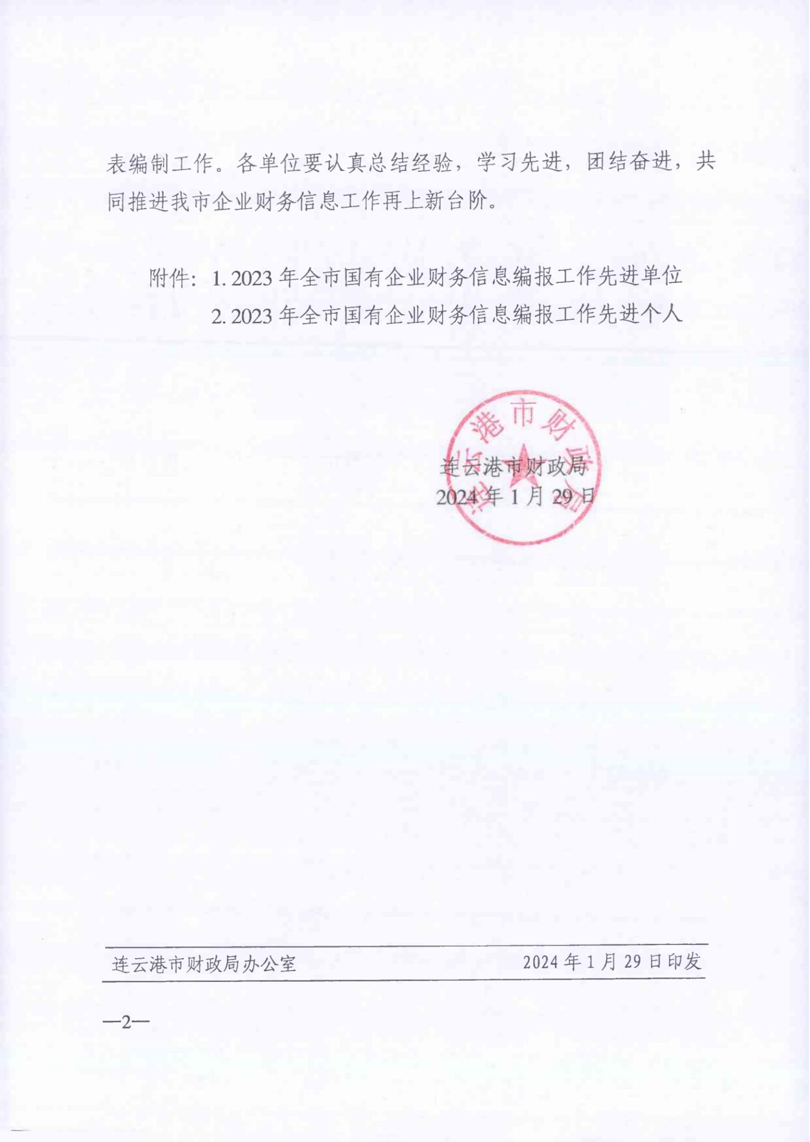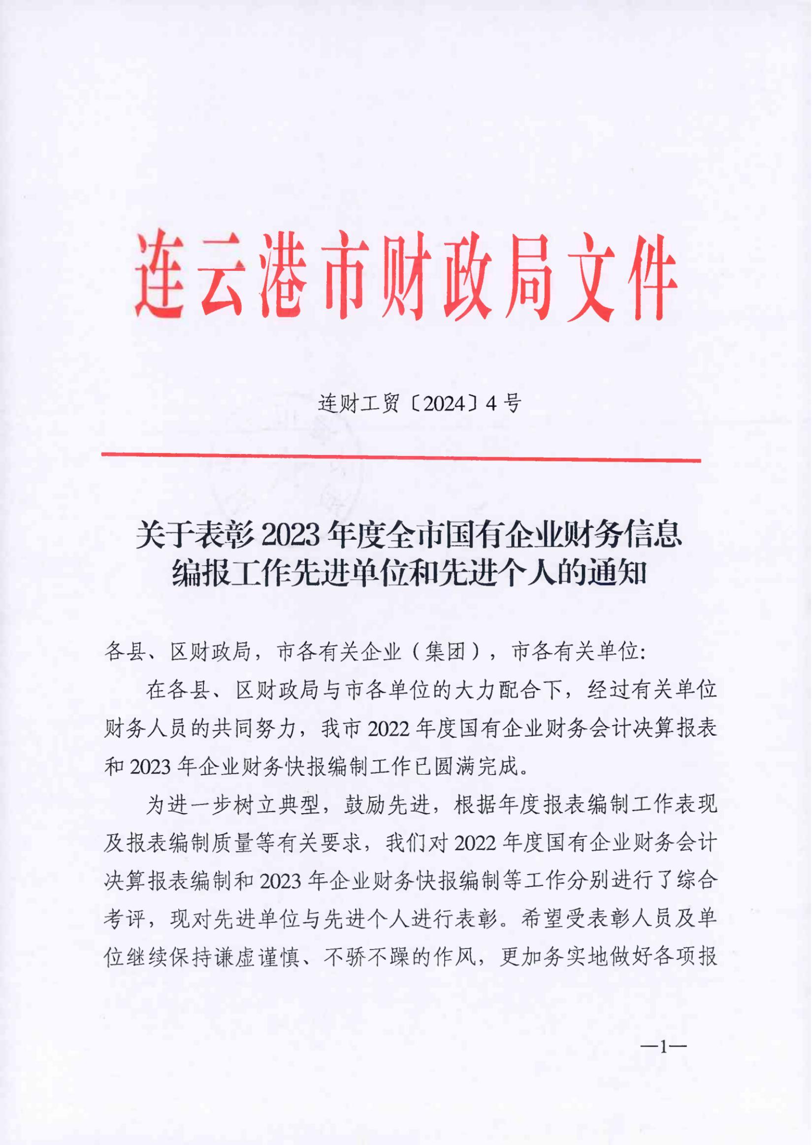日前,經(jīng)連云港市財(cái)政局下發(fā)的連財(cái)工貿(mào)【2024】4號(hào)《關(guān)于表彰2023年度全市國(guó)有企業(yè)財(cái)務(wù)信息編報(bào)工作先進(jìn)單位和先進(jìn)個(gè)人的通知》文件獲悉,集團(tuán)被評(píng)為全市財(cái)務(wù)信息工作先進(jìn)單位,集團(tuán)財(cái)務(wù)融資部聶丹被評(píng)為財(cái)務(wù)信息工作先進(jìn)個(gè)人。