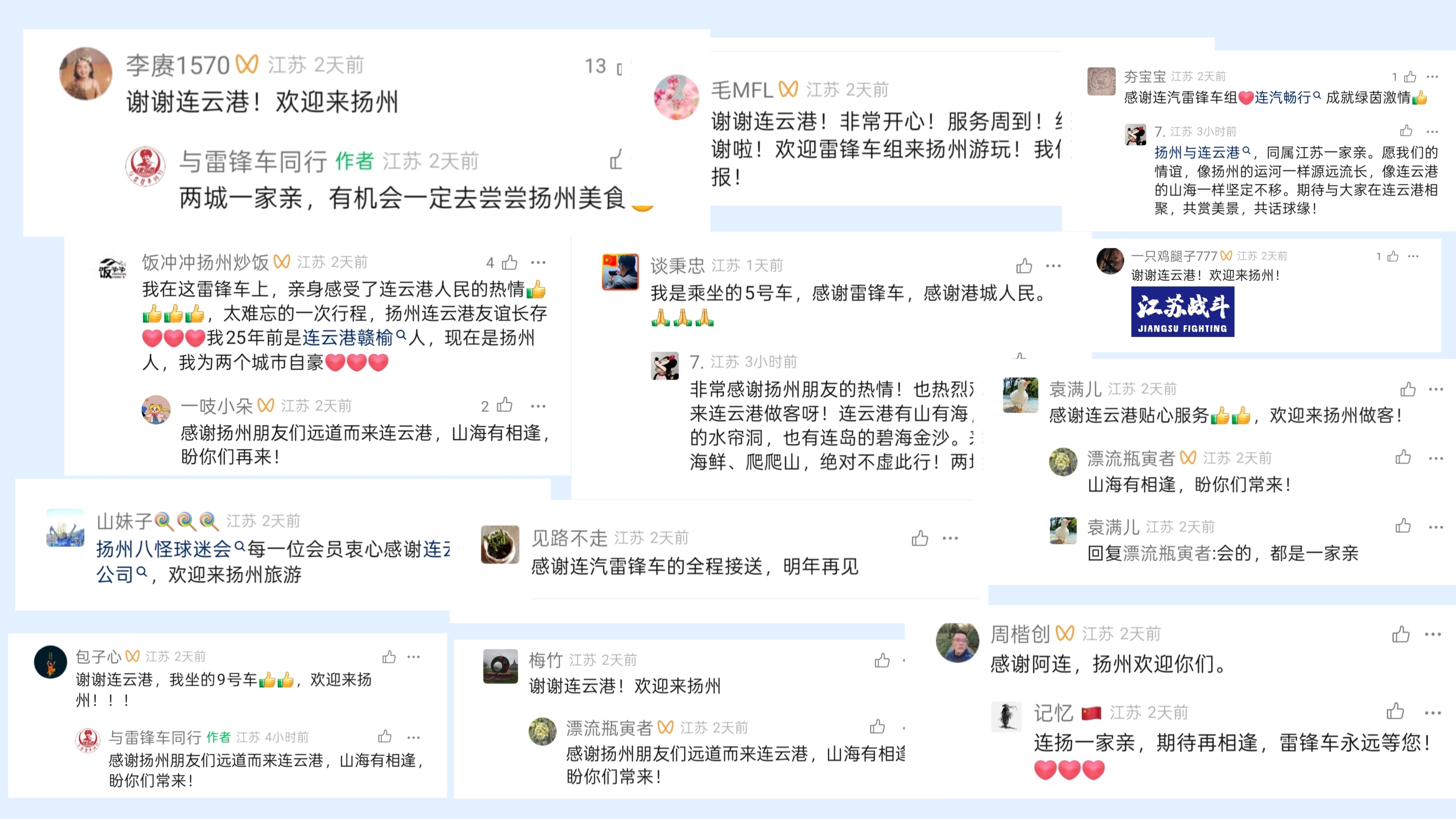 賽事落幕,溫暖卻在延續(xù)。賽后,揚州球迷紛紛在社交平臺留下真摯留言,字里行間滿是感動與謝意:“謝謝連云港!歡迎來揚州。”“‘雷鋒車’讓我親身感受了連云港人民的熱情,太難忘的一次行程,揚州連云港友誼長存!”“謝謝連云港!非常開心!服務(wù)周到!細(xì)致用心!謝謝啦!歡迎‘雷鋒車’組來揚州游玩!我們一定熱情回報!”“連汽的優(yōu)質(zhì)服務(wù)必須點贊!阿連‘雷鋒車’友誼地久天長!”這些樸實的話語,不僅是球迷對“雷鋒車”組服務(wù)的認(rèn)可,更是對連云港城市文明形象的由衷褒獎。